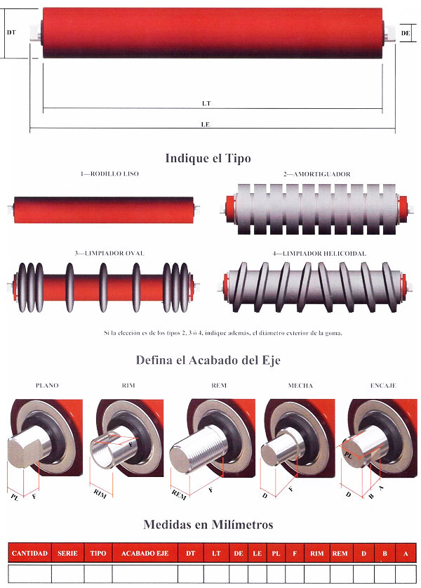 - Rodillos de minería: Posibilidad desde Ø 60 hasta Ø 159 y ejes desde Ø 15 hasta Ø 60. Además a este rodillo se le puede insertar aros amortiguadores, aros helicoidales, aros limpiadores, recubrimientos de caucho liso o rayado, etc.
